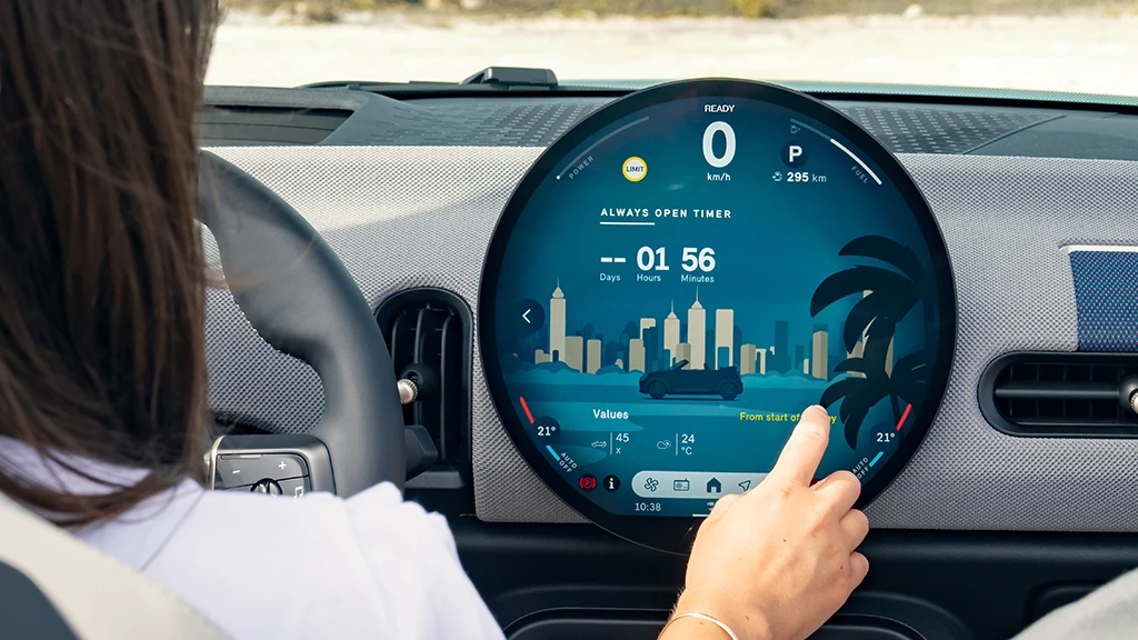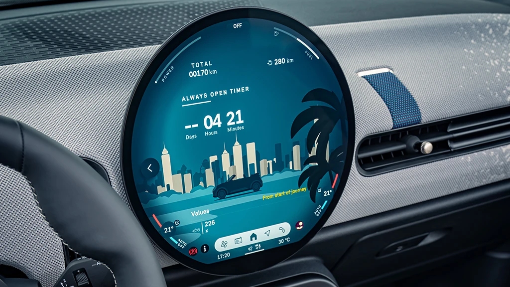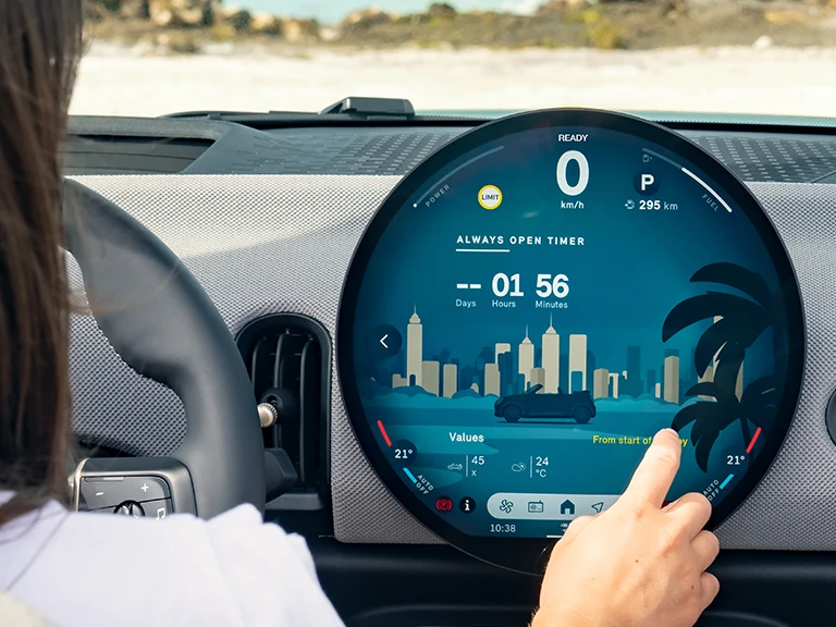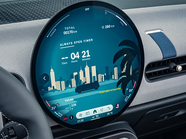 The MINI Always Open Timer is a unique feature offered in MINI Convertible models, which tracks the amount of time you spend driving with the top down. This playful and distinctive feature is designed to celebrate and encourage open-top driving by keeping a record of the convertible experience.